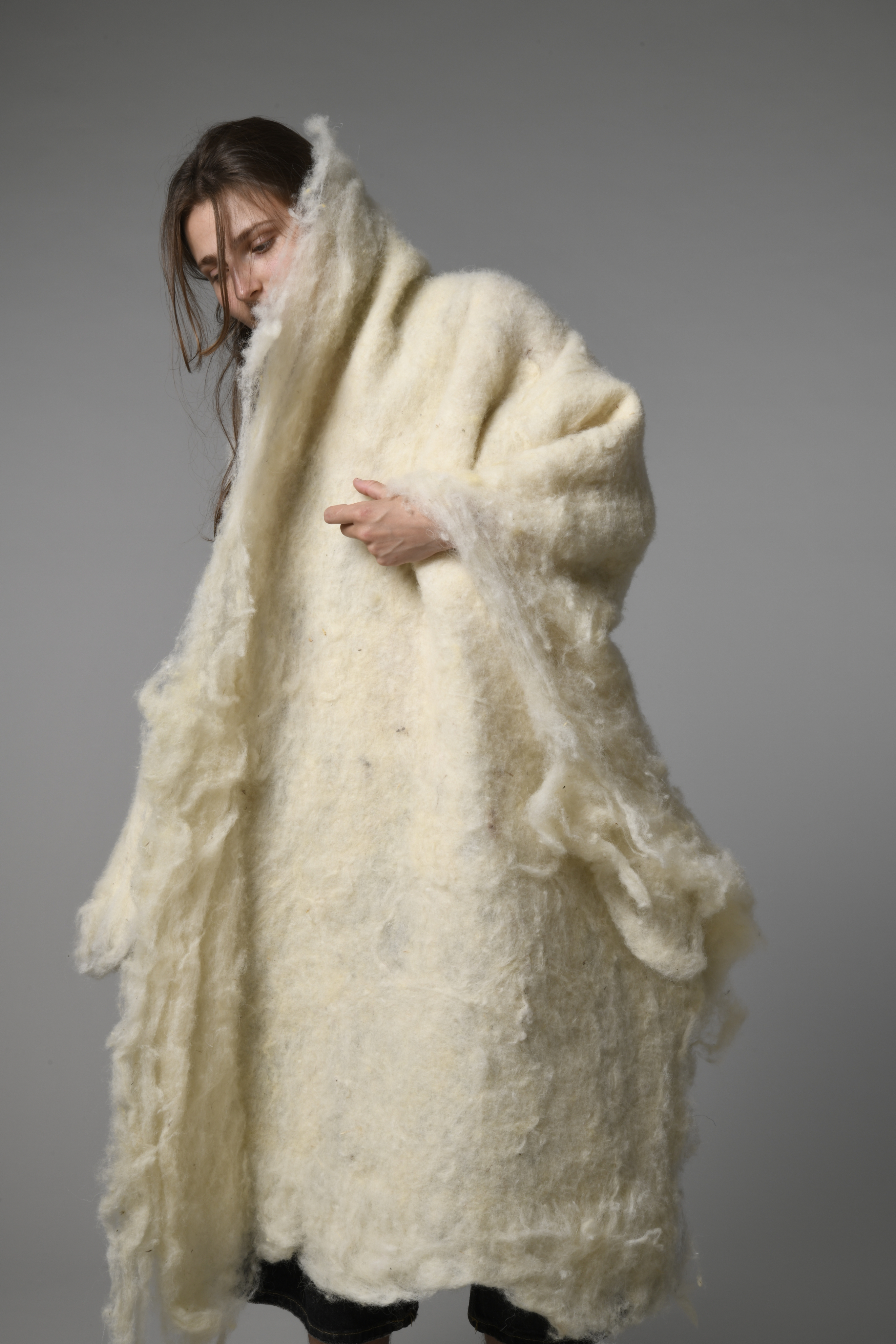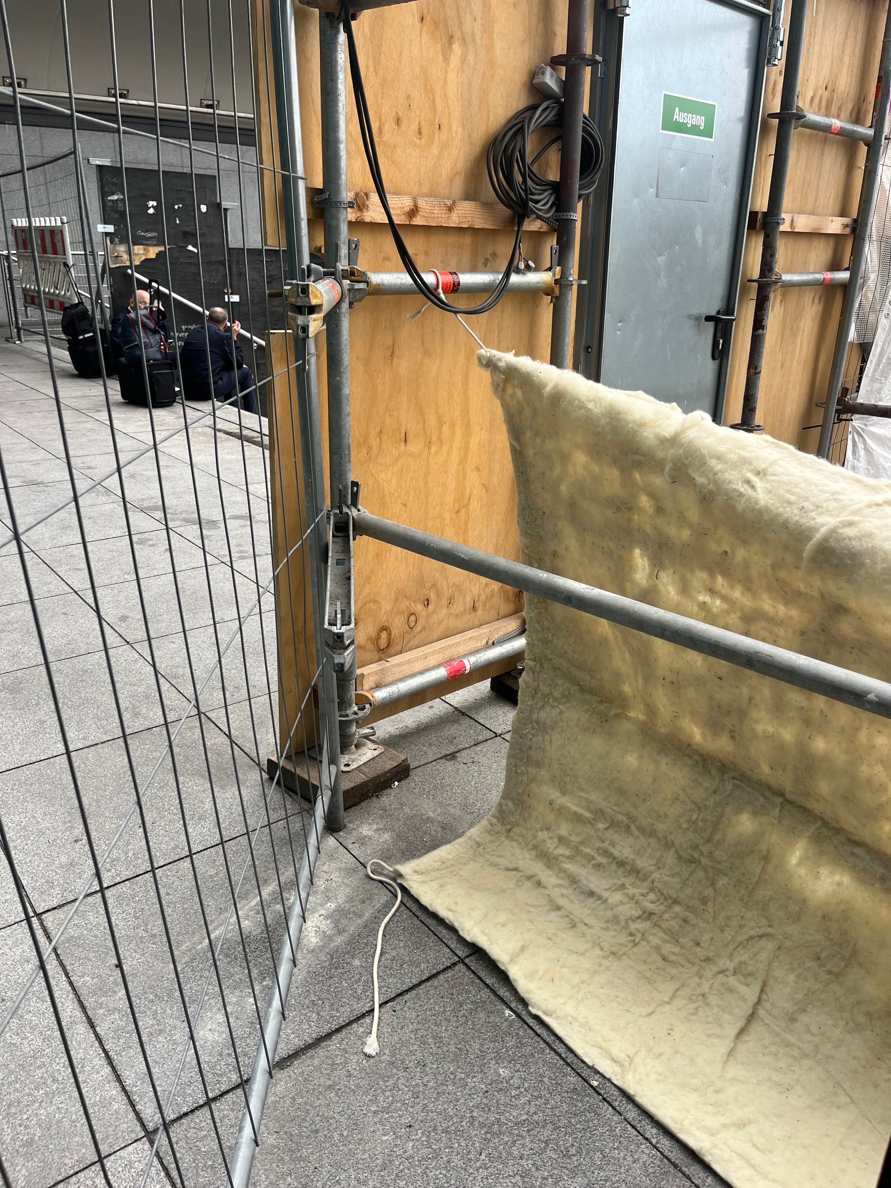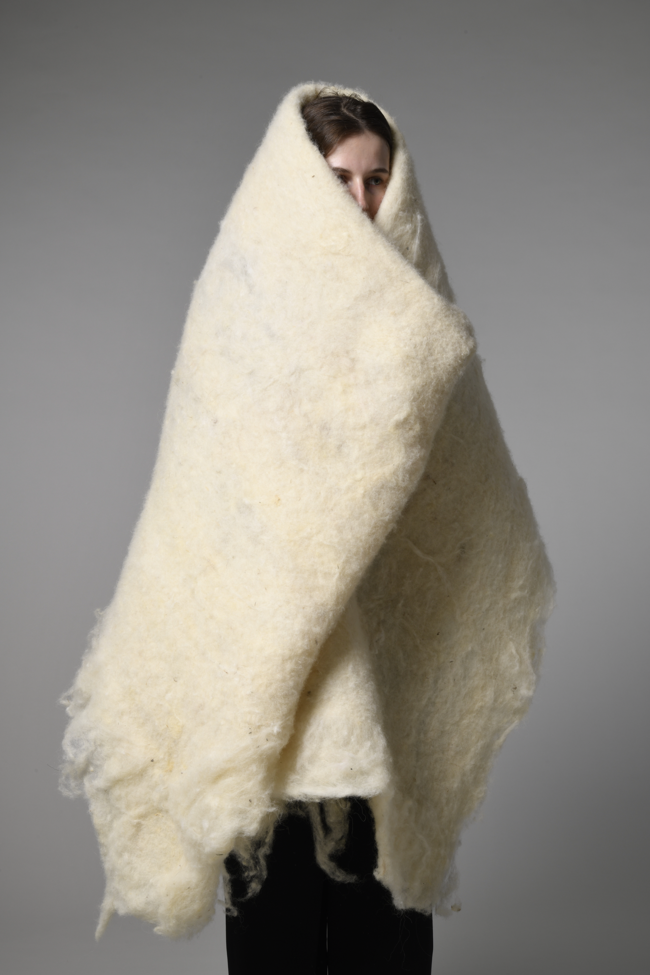 In verschiedenen Schritten haben wir mit der Wolle experimentiert – sie gereinigt, entwirrt und mit unterschiedlichen Filztechniken verarbeitet. Dabei kamen auch Kombinationen mit Materialien wie Nesselstoff zum Einsatz. Auf unserem Weg zur endgültigen Form sind so vielfältige Strukturen und Oberflächen entstanden.
