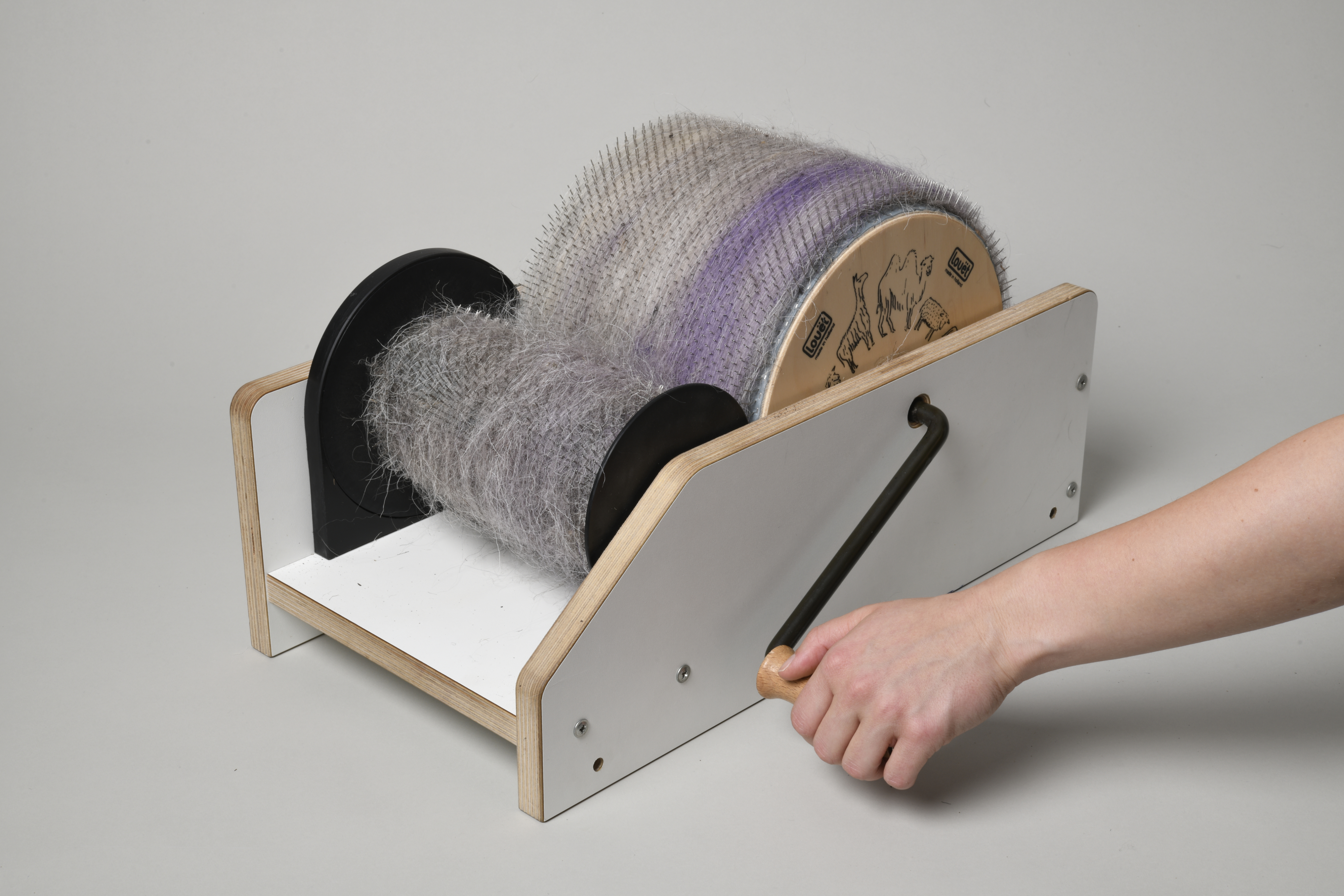 Klicke dich durch die folgenden Bilder, um einen Einblick in den Prozess des kardierens zu bekommen. Beim Kardieren werden die Fasern gereinigt, entwirrt und parallel ausgerichtet – eine wichtige Vorbereitung für unsere Filzmatte. So entsteht aus losen Fasern ein gleichmäßiges Vlies mit angenehmer Struktur.