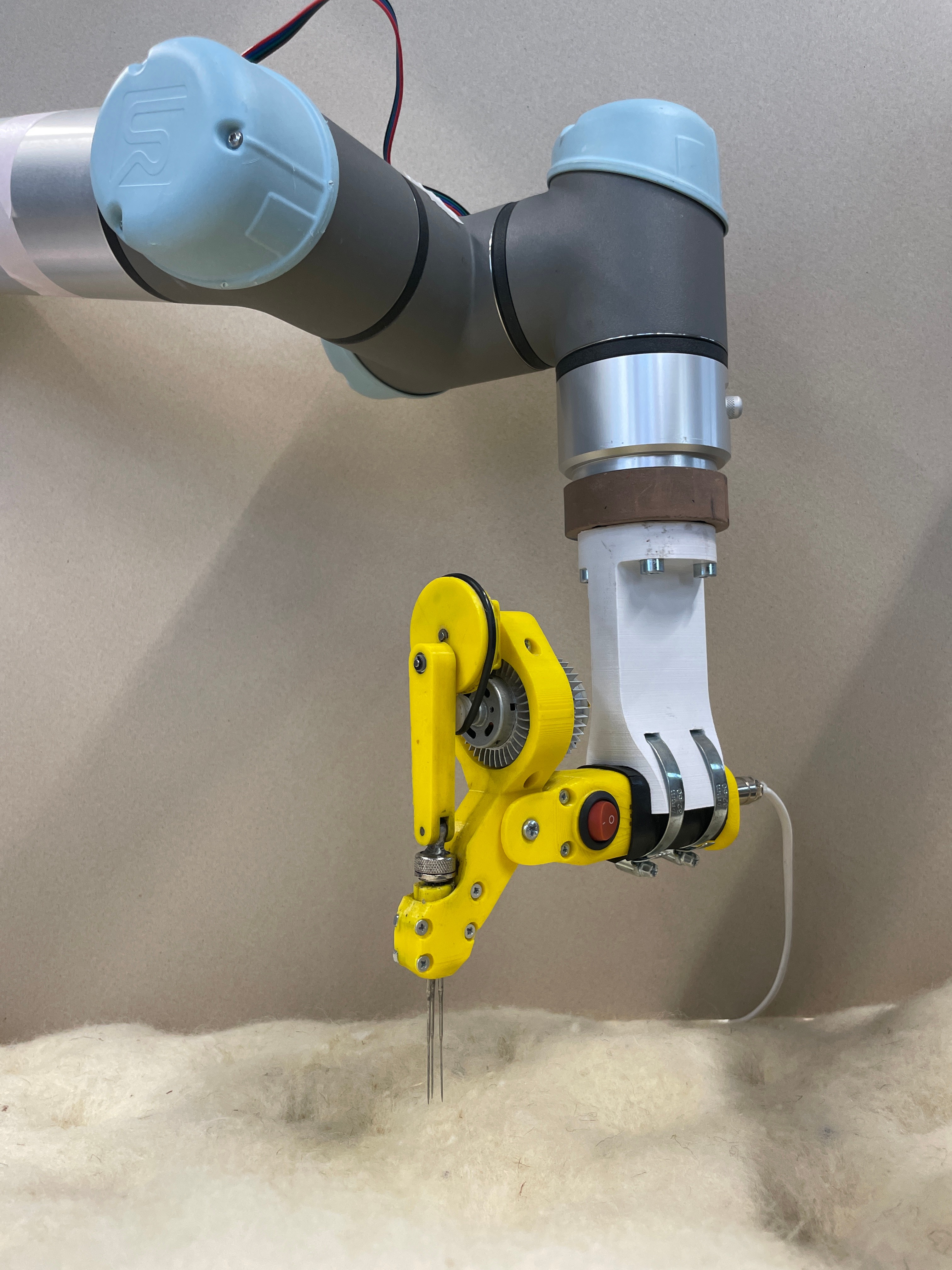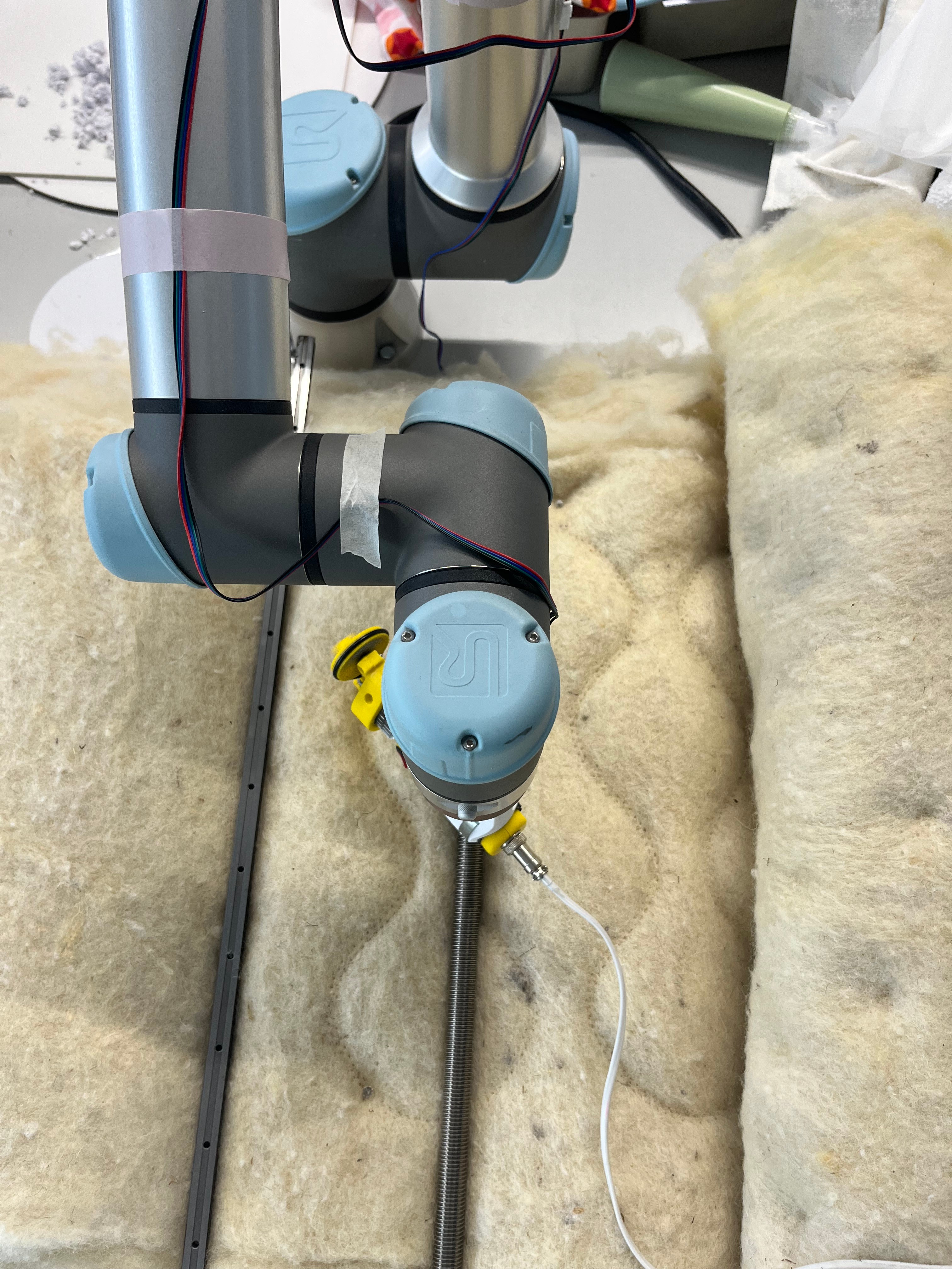 Um das volle Potenzial lokaler Wolle auszuloten, kombinierten wir Handarbeit mit Technologie: Ein Roboterarm mit speziellem Filzaufsatz half uns, wiederholbare Filzstrukturen zu erzeugen und gezielt mit Druck und Bewegung zu experimentieren. Diese automatisierten Tests ermöglichten uns präzise Vergleiche in der Materialverarbeitung.