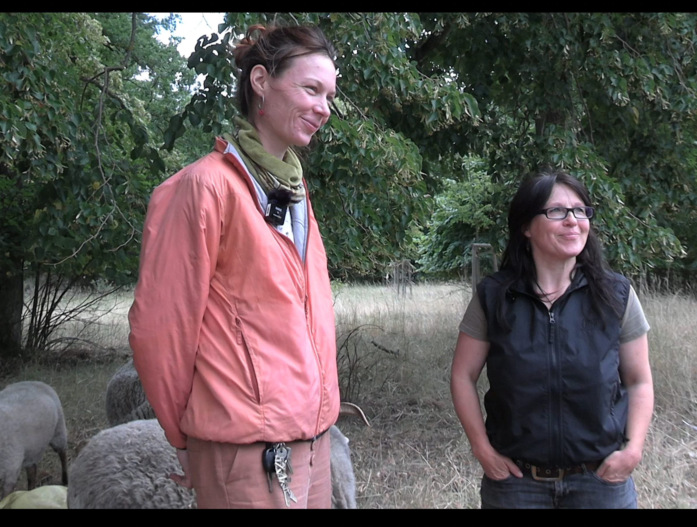 Anne Wiedemann, Promovierende an der Hochschule für nachhaltige Entwicklung Eberswalde, und Heike Preuße, einer Schäferin mit einer Schafherde von ca. 12 Schafen.